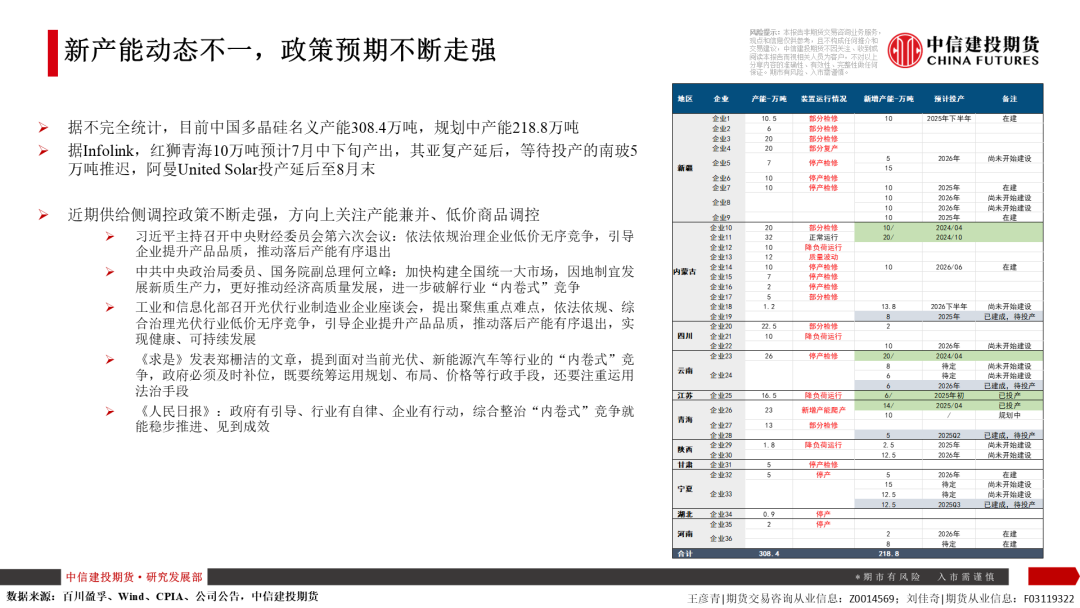 政策交易或移至时点的确认:短期来看市场仍在交易供给侧调控预期,政策走强下硅料厂报涨又反过来加重多头情绪,预期交易的情绪底已经基本显现。从预期交易角度看,我们认为应当继续保持对本轮供给侧调控力度的信心,产能兼并、落后产能淘汰以及低价商品调控等均是值得期待的方向;但从节奏上看,预计后市交易节奏或将逐步转移到对政策落地时点的确认,随着市场分歧加剧,盘面波动或将继续放大
