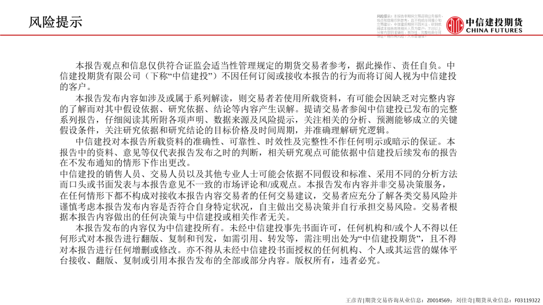 免责声明]article_adlist-->本报告观点和信息仅供符合证监会适当性管理规定的期货交易者参考,据此操作、责任自负。中信建投期货有限公司(下称“中信建投”)不因任何订阅或接收本报告的行为而将订阅人视为中信建投的客户。]article_adlist-->本报告发布内容如涉及或属于系列解读,则交易者若使用所载资料,有可能会因缺乏对完整内容的了解而对其中假设依据、研究依据、结论等内容产生误解。提请交易者参阅中信建投已发布的完整系列报告,仔细阅读其所附各项声明、数据来源及风险提示,关注相关的分析、预测能够成立的关键假设条件,关注研究依据和研究结论的目标价格及时间周期,并准确理解研究逻辑。]article_adlist-->中信建投对本报告所载资料的准确性、可靠性、时效性及完整性不作任何明示或暗示的保证。本报告中的资料、意见等仅代表报告发布之时的判断,相关研究观点可能依据中信建投后续发布的报告在不发布通知的情形下作出更改。]article_adlist-->中信建投的销售人员、交易人员以及其他专业人士可能会依据不同假设和标准、采用不同的分析方法而口头或书面发表与本报告意见不一致的市场评论和/或观点。本报告发布内容并非交易决策服务,在任何情形下都不构成对接收本报告内容交易者的任何交易建议,交易者应充分了解各类交易风险并谨慎考虑本报告发布内容是否符合自身特定状况,自主做出交易决策并自行承担交易风险。交易者根据本报告内容做出的任何决策与中信建投或相关作者无关。]article_adlist-->本报告发布的内容仅为中信建投所有。未经中信建投事先书面许可,任何机构和/或个人不得以任何形式对本报告进行翻版、复制和刊发,如需引用、转发等,需注明出处为“中信建投期货”,且不得对本报告进行任何增删或修改。亦不得从未经中信建投书面授权的任何机构、个人或其运营的媒体平台接收、翻版、复制或引用本报告发布的全部或部分内容。版权所有,违者必究。]article_adlist--> 新浪合作大平台期货开户 安全快捷有保障